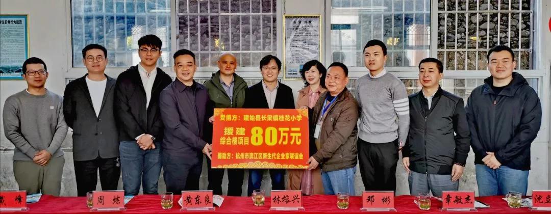 在捐赠仪式上,区新生代企业家联谊会会长、杭州兴耀控股集团有限公司总裁黄东良代表其他9名新生代企业家(东冠集团有限公司总裁章敏杰;海威控股有限公司总经理莫炜国;杭州萧宏建设环境集团有限公司总经理俞飞;杭州金盛集团有限公司总经理周炼;浙江富成建设集团有限公司总经理徐朱丹;杭州恒鑫投资合伙企业总经理沈立刚;杭州国力带索具有限公司总经理戴峰;浙江正河建设有限公司董事长章泽宁;杭州腾虎环境工程有限公司总经理韩京晶)共同出资80万元,帮助学校新建综合楼,以完善桂花小学的教学配套设施,为学生创造良好的学习环境,不断提升学校教育质量。